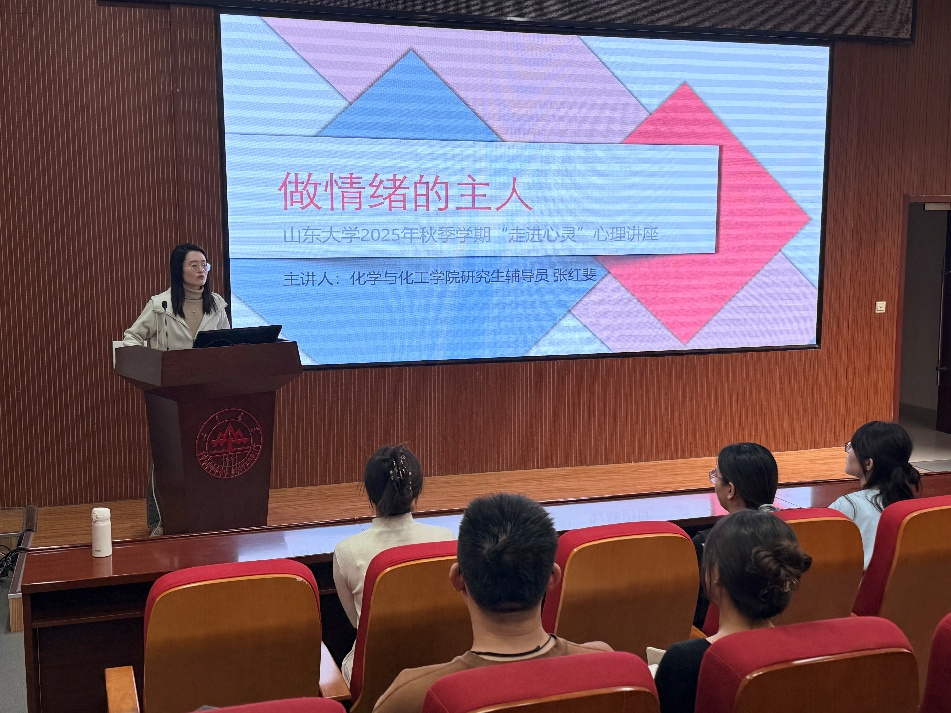 山东大学化学与化工学院近日举办“做情绪的主人”走进心灵主题讲座,由研究生辅导员张红斐主讲。讲座针对研究生群体常见的情绪困扰,从情绪本质、常见问题及管理方法三个维度展开系统讲解。