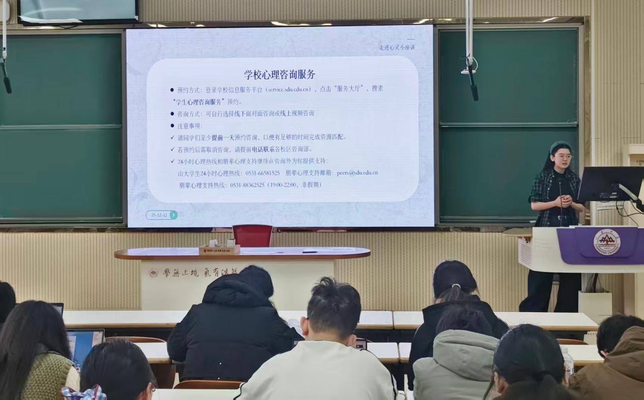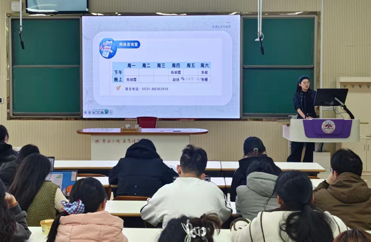 为加强大学生心理健康教育,提升学生心理调适能力,引导学生以积极心态面对学业与生活挑战,12月12日上午,我院于电教北楼201d教室面向2023级本科生举办“走进心灵”心理健康主题讲座。本次讲座由2023级辅导员孙雅乔主讲,围绕心理健康知识普及、压力调适方法、学业规划等内容展开,旨在帮助学生树立正确的心理健康观念,增强自我关怀与生涯发展意识。