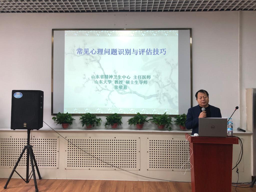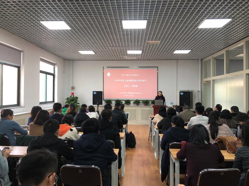 11月20日,心理中心在中心校区举行“大学生常见心理问题识别和评估技巧”讲座。山东省精神卫生中心张敬悬教授主讲,各单位分管学生工作副书记和新生辅导员参加,心理中心主任傅艺娜主持。