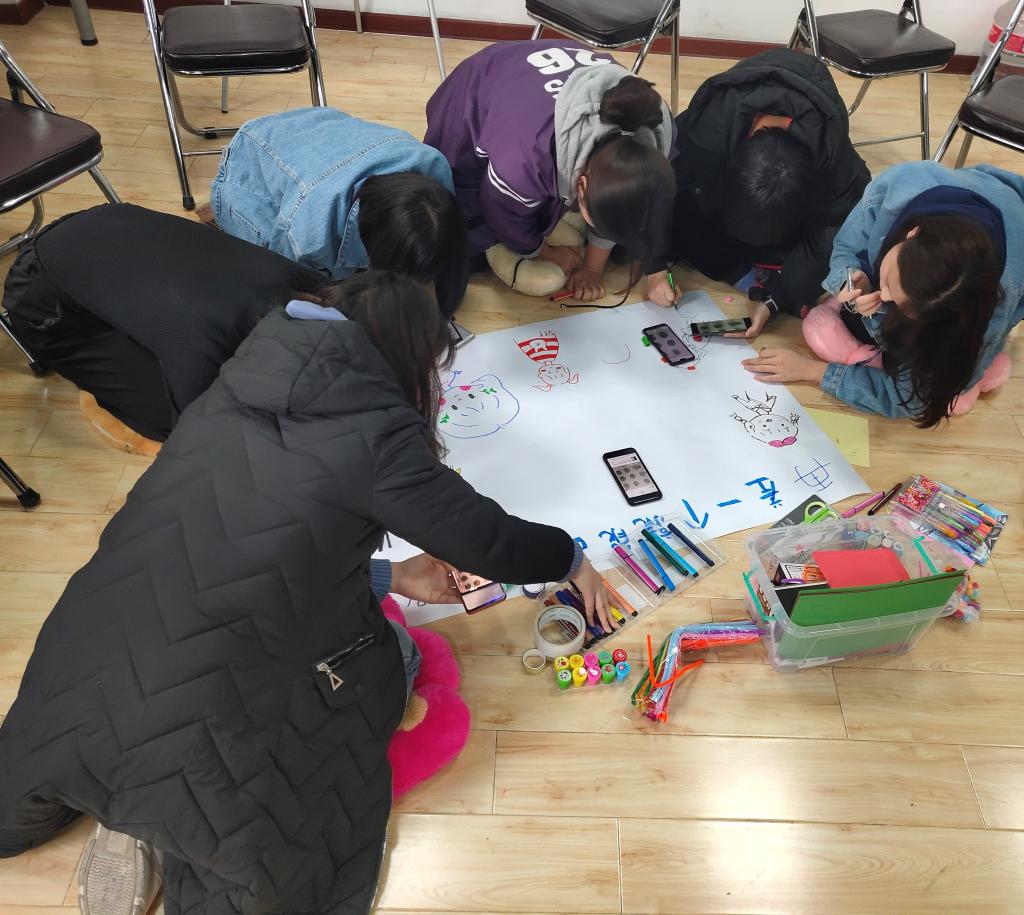 在第一次团体辅导过程中,领导者介绍了本次团体辅导的目标和开展形式,通过微笑相识、花样握手、名字的故事等不同的方式促进团体成员相互认识;在制作海报环节中,成员们积极讨论、分工合作、发挥所长,在合作中彼此熟识,并通过共同拟定团体规范的方式建立信任;随后,成员们通过自画像的方式“认识”了自己眼中的自己,也让团体中的其他人对自己有了进一步的认识。第一次团体辅导在轻松自由的氛围中结束。