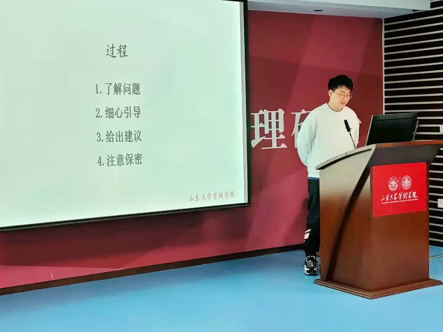 49日晚,管理学院于知新楼B218会议室举办走进心灵系列讲座,主题为“情绪管理中的朋辈力”。讲座由大学生心理健康教育兼职教师、管理学院辅导员綦亮主讲,管理学院本科生、研究生各班级心理委员参加了本次活动。