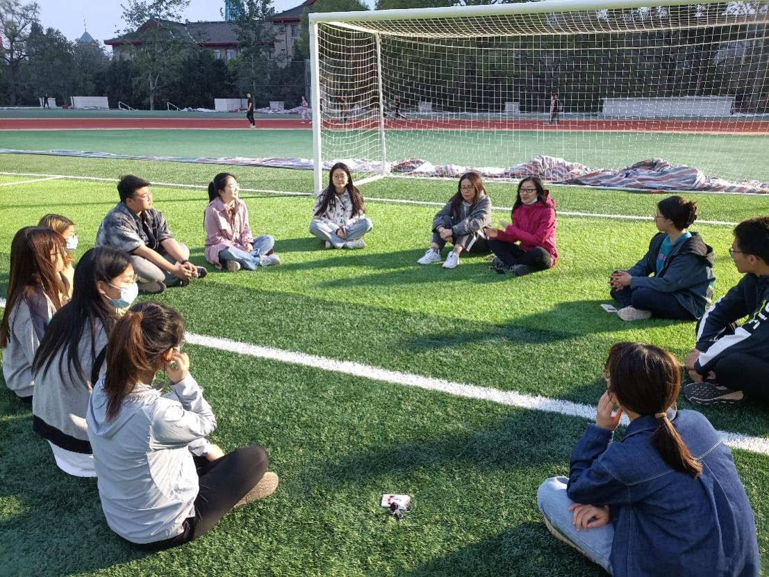 大家放松地围坐草地,首先请上次未能见面的伙伴们重新彼此介绍。师生进行了亲切而友好的交谈,交流回顾了过去一周志愿者自身和身边同学们的学习、工作和身心健康状况,特别是较之前的变化,并针对这些变化如何调整工作方案进行探讨。