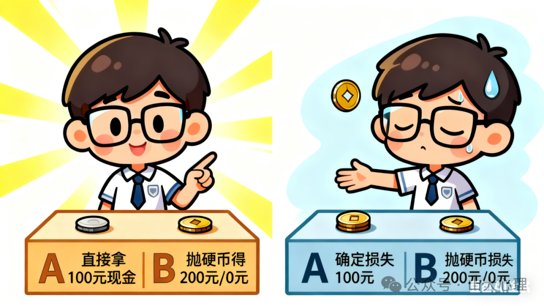 心理学家做过一个经典实验:给参与者两个选择,A选项是直接获得100元,B选项是抛硬币,正面朝上获得200元,反面朝上一无所获。从数学概率看,两个选项平均收益都是100元,但超80%的人选择了稳拿100元的A选项。这是因为比起“可能多赚100元”,人们更害怕“失去本可以直接到手的100元”。更有趣的是,当实验反过来,要求参与者必须损失一笔钱时,大部分人宁可冒险抛硬币赌一把,也不愿接受确定的损失——这就是损失厌恶的双面性:面对收益时求稳,面对损失时冒险。