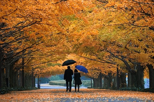 这样的秋景是诗吧!头顶、脚下是自然,是“接天落叶无穷阔”的惬意,是漫步其中的浪漫悠闲。撑一把伞,无雨的季节也不是装饰品,因为还有落叶呢!落叶纷纷,不忍心让它半路夭折,还是直接落在土里吧,那是真正的归宿。