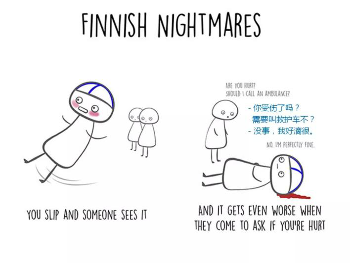 以上的场景都源于芬兰的插画绘本《芬兰人的噩梦》。每个人看到这些,多多少少都会有些共鸣,觉得这不就是说的我吗?在我国,许多年轻人觉得自己常常被迫社交,而芬兰人的这种独处精神大大激励了他们,让他们懂得,独处和避免不必要的社交并不一定是一件坏事。同时,也有部分人将“精芬”与社交恐惧划等号,自嘲有“社恐症”。但事实上“内向性格”和心理病理学意义上的社交恐惧症还是有着本质区别。