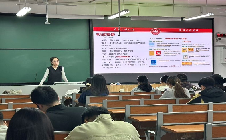 在内容讲解环节,朱蕾结合详实资料与教学经验,分别从考研、保研与境外升学三个方面进行深入解读。考研部分重点介绍了关键时间节点、信息获取渠道与备考资源;保研部分详细讲解了综合评价成绩的构成,并在竞赛、科研、英语能力等方面提出提升建议;境外升学部分则涵盖院校选择、材料准备、语言考试与奖学金申请等内容,并提醒同学们理性看待中介服务,主动把握申请过程。