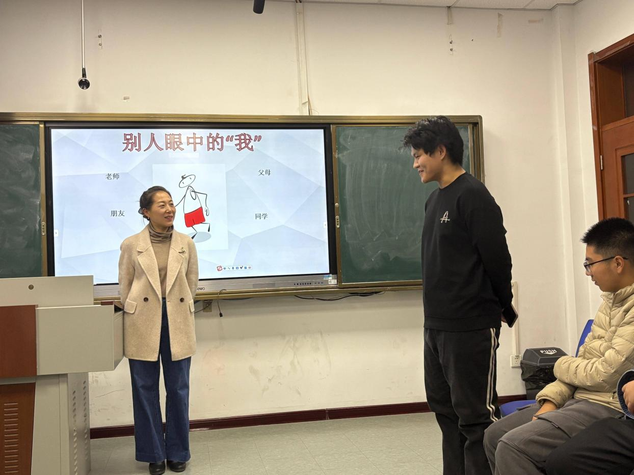 随后进入“别人眼中的我”分享环节。赵婧婧老师首先分享了自身经历,谈及如何将“向内指责”的惯性,转化为温暖而向上的成长力量。在她的鼓励下,同学们也纷纷敞开心扉,讲述自己在社会比较中的困惑、在他人评价中的摇摆。大家认识到,外界的评价虽能提供镜鉴,却也容易成为心灵的枷锁;真正的自我价值感,源于内在的建构与确认,而非完全依赖外界的回响。现场氛围真诚而包容,每一次分享都伴随着理解的掌声,每一次倾听都传递着无声的共情。