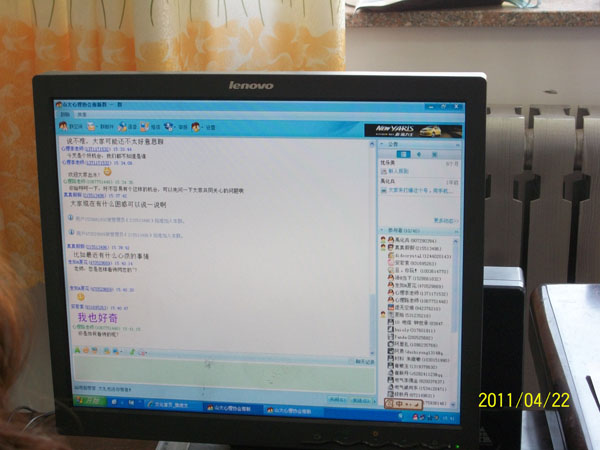 4月22日下午三点半,在兴隆山校区实验楼心理咨询室701室,心理健康教育与咨询中心的李老师和路老师通过QQ网上工具为同学们解疑答惑。此次咨询活动主要采用同学们易于接受的网上聊天形式,吸引了许多同学参与此次活动。两位咨询老师为同学们解答了网恋和人际交往等各方面的困惑。轻松的气氛与同学们的参与热情充分证明了这是一次成功的网上服务活动。