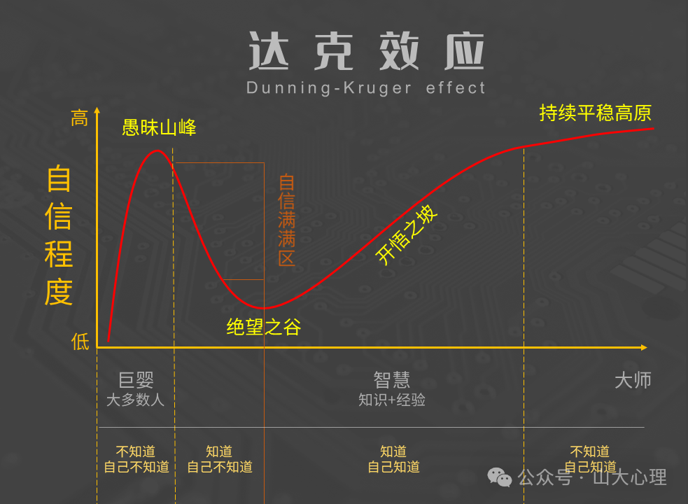 这幅图所描绘的是邓宁-克鲁格效应,也称为“达克效应”。它指的是一种认知偏差,即认知水平较低的个体更容易陷入自信过剩的状态。然而,这种自信只是由于对自己的估计出现偏差,导致一种虚幻的自我优越感。个体之间的行为差异在很大程度上源自这种认知上的偏差。认知水平较低的个体在面对与自己观念不一致的人时,往往会感到强烈的不适,从而将自己的感受和意愿强加于他人。相反,认知水平较高的人,即使与他人持不同观点,也不会急于驳斥。他们懂得包容,能够站在对方的角度思考,接纳不同的意见,从而提升自身的认知水平。